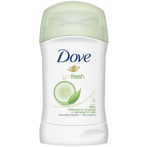 Женский антиперспирант-стик DOVE (Дав) Прикосновение свежести 40 мл, без содержания спирта, с взрывным ароматом зеленого чая и свежесорванного огурца, предоставляет надежную защиту от запаха пота в течении 24 часов.