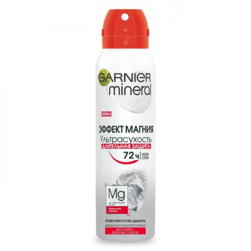 Garnier Дезодорант-антиперспирант спрей "Эффект магния Ультрасухость" первый дезодорант-антиперспирант с абсорбирующим магнием для защиты от запаха на 72 часа и мгновенной сухости. Позволяет коже дышать. Открой для себя силу магния – абсорбирующего минерала. Открой для себя силу магния – абсорбирующего минерала из натуральных горных пород, который впитывает в 4 раза больше влаги, чем тальк. Магнезия, в состав которой входит магний, часто используется спортсменами для обеспечения мгновенной сухости рук.