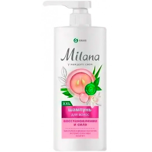 Шампунь «Milana» от бренда Grass с кератином «Восстановление и сила» предназначен для бережного очищения и восстановления сухих и повреждённых волос. Объём одного флакона — 1 литр.