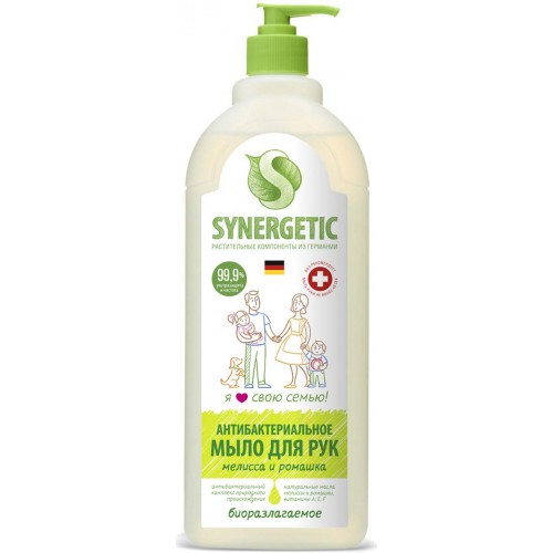 Антибактериальное жидкое мыло Synergetic «Мелисса и ромашка». Подходит для бережного очищения кожи рук и тела. Эффективно устраняет запахи и загрязнения даже в холодной воде. Мыло обладает антибактериальным действием за счет синергетической комбинации мягких растительных К-тензидов, морской соли и натуральных эфирных масел. Пролонгированный антибактериальный эффект. Создает невидимый защитный слой, сохраняя антибактериальный эффект до 3-х часов с защитой от поражения микроорганизмами. Длительное увлажнение кожи. Эффективный натуральный увлажнитель – глицерин. Способствует длительному увлажнению кожи. Восстановление кожи рук. Комплекс витаминов A, E, F в составе мыла повышает сопротивляемость кожи рук к вредным воздействиям окружающей среды.