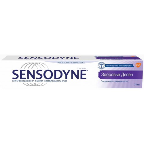 Зубная паста Sensodyne Здоровье Десен для чувствительных зубов обладает всеми преимуществами гигиены полости рта, которые вам необходимы: Эффективно снижает повышенную чувствительность зубов, обеспечивает защиту от чувствительности в течение всего дня; Поддерживает здоровье десен, замедляя рост бактерий благодаря содержанию цитрата цинка; Зубная паста защищает от кариеса благодаря содержанию фтора при чистке 2 раза в день.