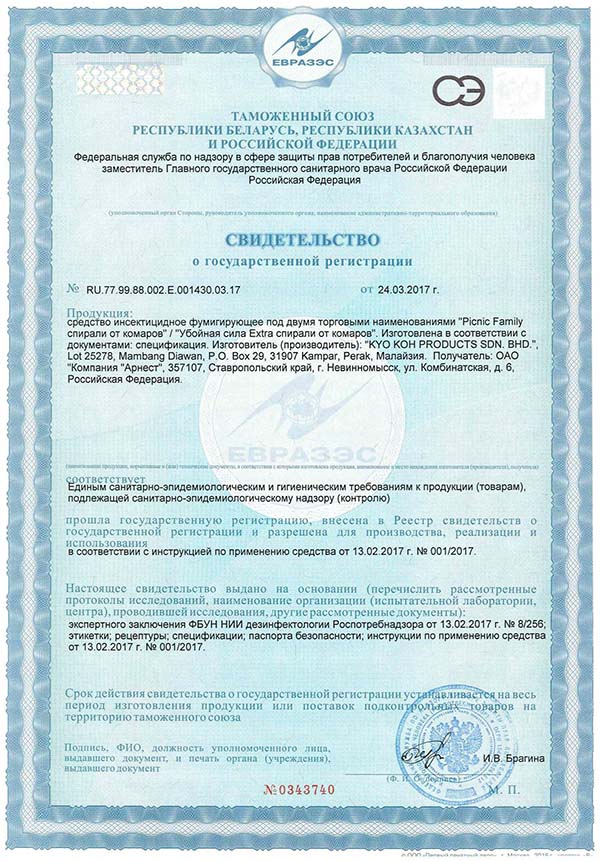Свидетельство на Спирали от комаров Picnic (Пикник) Family, 10 шт: посмотреть/загрузить